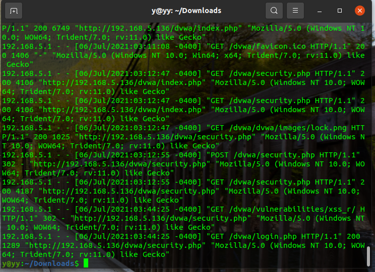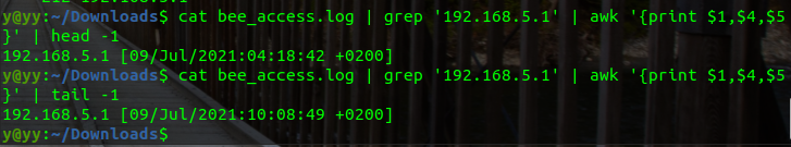 $ cat bee_access.log | grep '192.168.5.1' | awk '{print $1,$4,$5}' | tail -1 // 마지막줄은 공격을 끝낸 시간