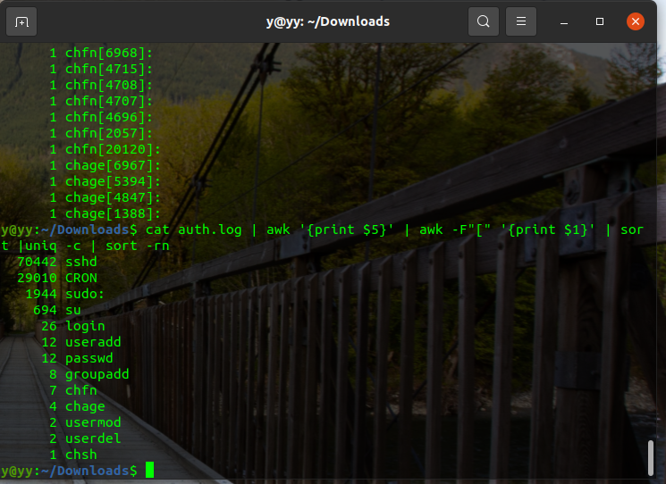 $ cat auth.log | awk '{print $5}' | awk -F"[" '{print $1}' | sort | uniq -c | sort -rn