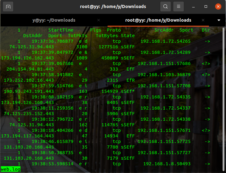# ra -nzr 1_merged_total.arg - "src net 192.168.1.0/24 and dst port (443 or 80) and tcp" > web.log