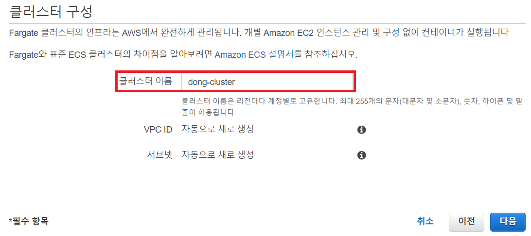 7. 클러스터 이름 설정. 나머지 VPC, 서브넷, 보안그룹은 자동으로 생성된다.